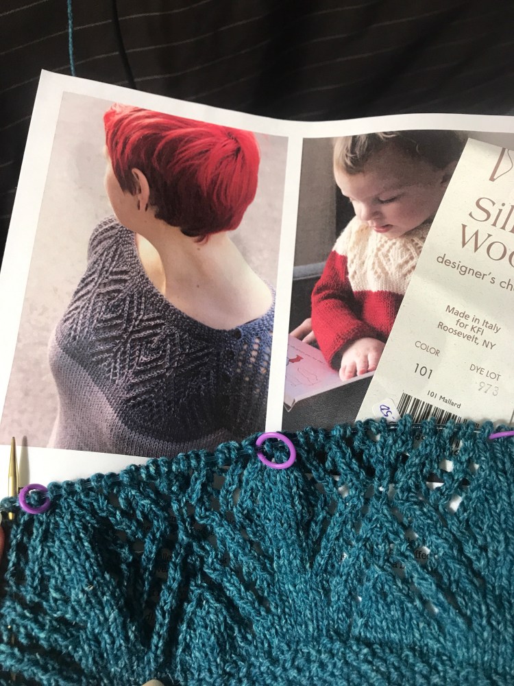 This is Snowflake by TinCanKnits in Elsebeth Lavoisier Silky Wool -Mallard. If you haven’t tried this yarn… I’m almost through one skein and it is weightless! This is going to be an awesome summer work top. Coverage when I need it indoors but light as a feather for outside. I’m about 2/3 through the lace then join in the round and go!
