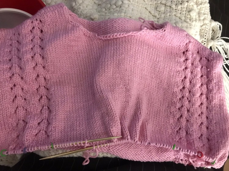 Well today is Wednesday….All the Love has been on the needles four days. (At 7am today doesn’t count!) I’m already 3+ inches past the arm hole join!