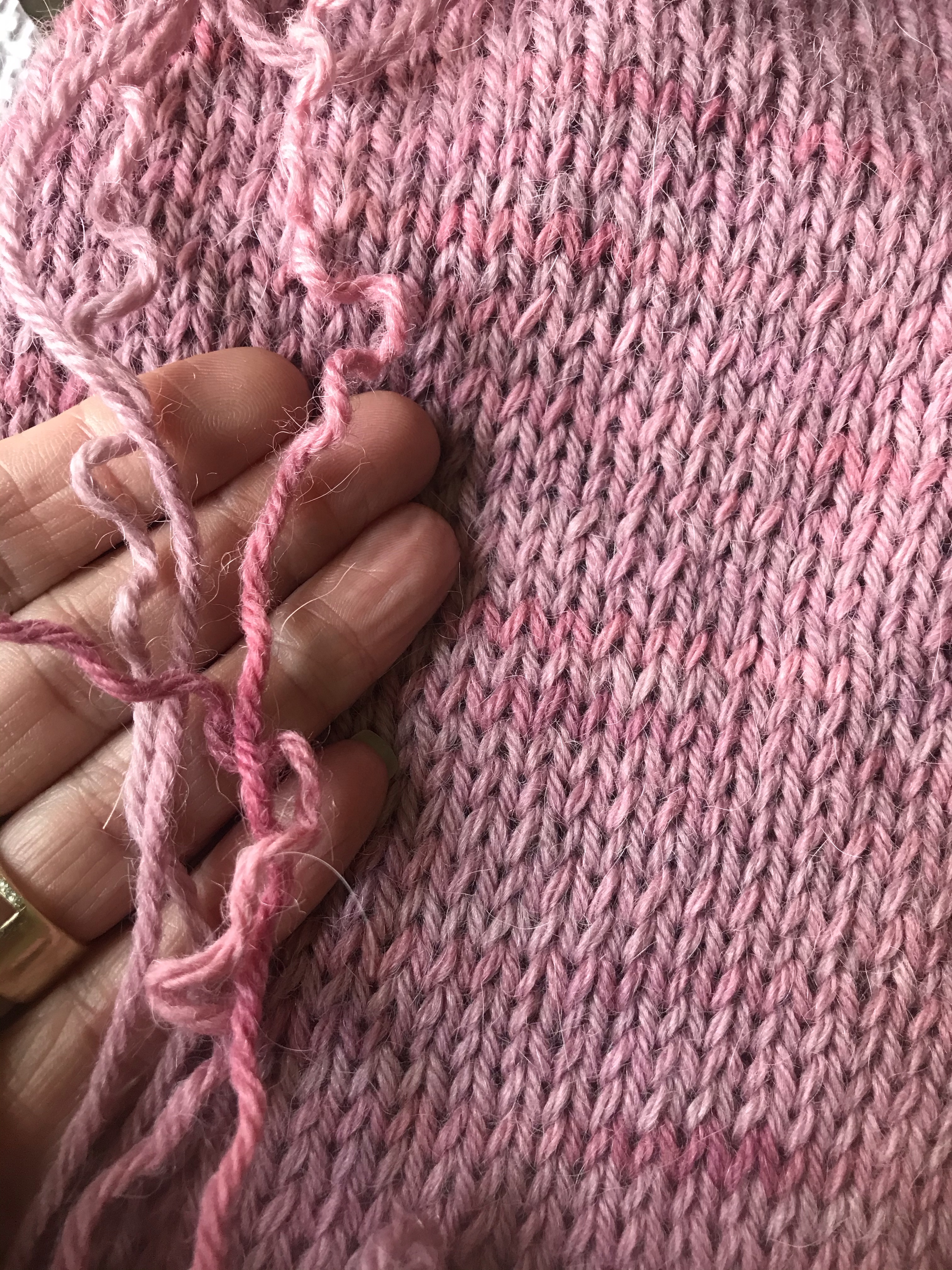Ranunculus #2 is finished (in 4 evenings plus a weekend – 6 days) and so is my Twisted Little Raglan (21 days, it is fingering weight after all). I love them both! The pink in the photo is an errant start to my Love Note. This is some ancient stash yarn 50/50 alpaca/wool, but when I reached the middle…about 8 inches below the join under the arms and realized that the incredibly splotchy…is that a word? yarn is just not how I want this to look. It ranges from pale pink to dark pink and alternating skeins succeeded only in creating a striped effect. So…I contacted Dianne – SuburbanStitcher and ordered some mohair in her Lagniappe colorway, and a skein of sock yarn just because! She was super helpful. Reskeining that yarn to rinse the kinks out and start again. I’m also designing a v-neck pullover with a basket weave pattern, using some ancient stash that I know is 100% acrylic but an incredibly soft to the touch off-white.