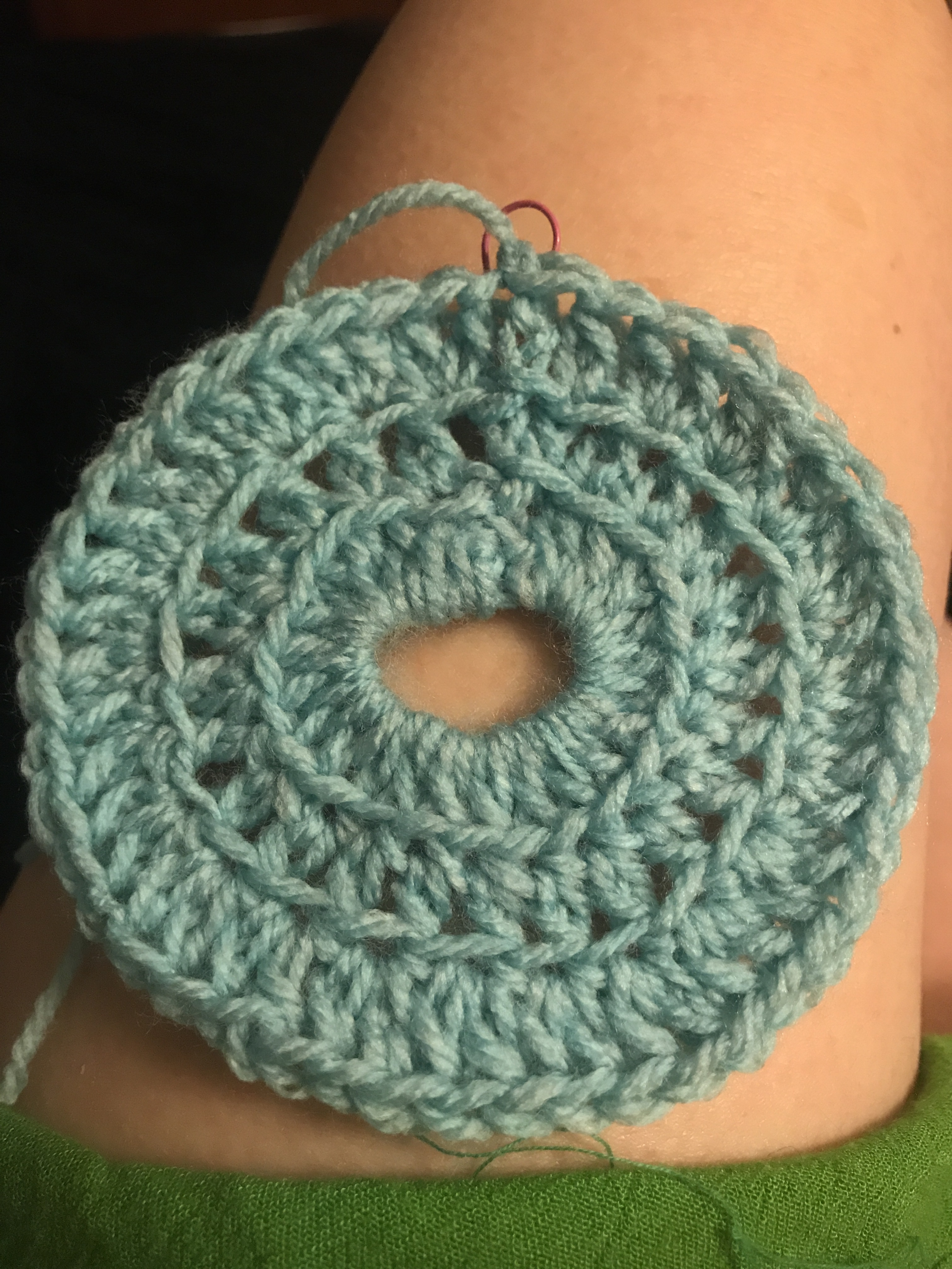 M’s chemo ended in April, so prep for surgery began. Current conditions required no visitors except 4 hours post-surgery, then nothing until discharge 5 days later….so lots of hotel knitting. Thank goodness for one of our children being able to come and keep me company for a bit. And, they crochet…so we had to have a lesson.
