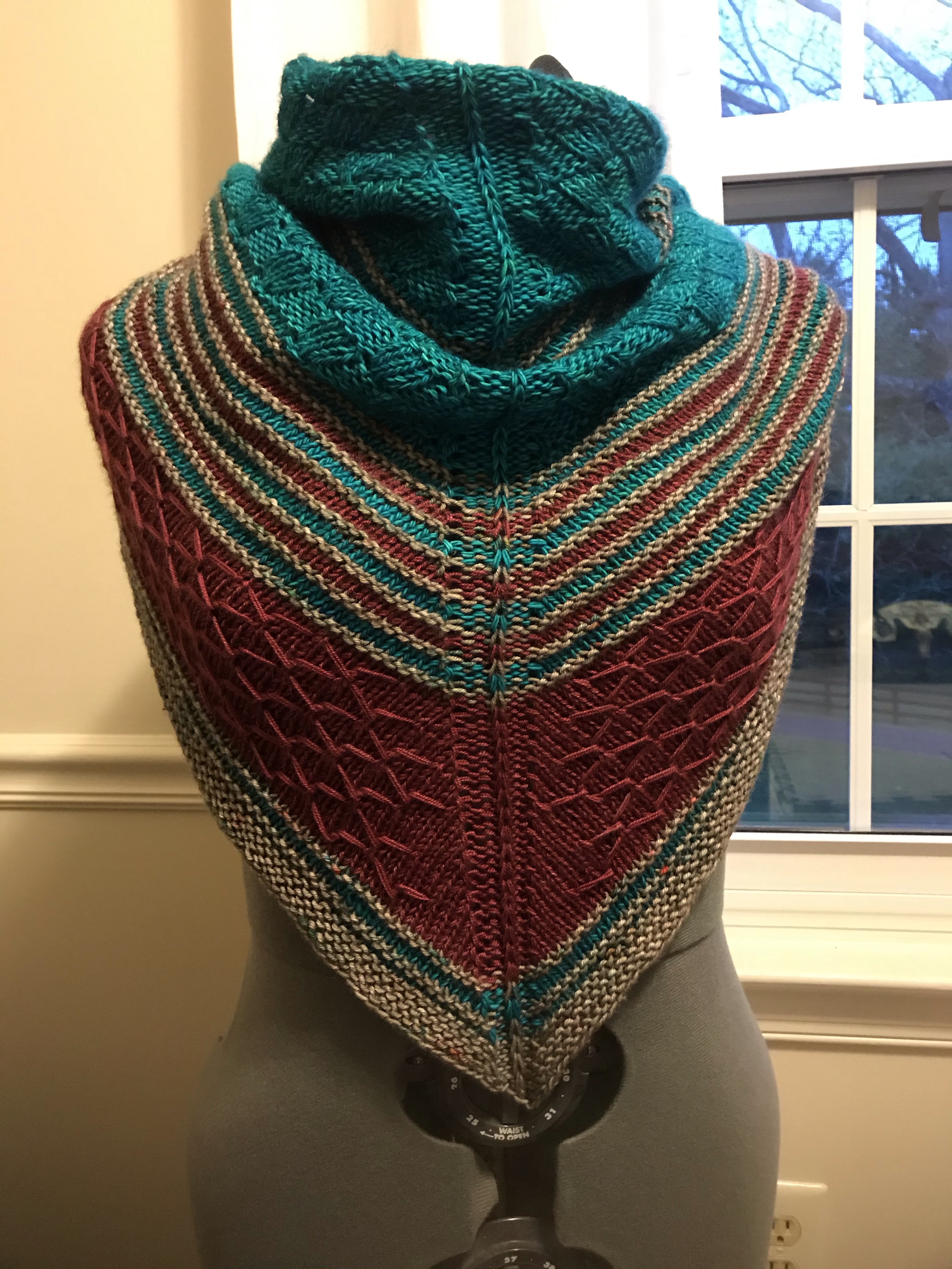 I’ve done so much knitting in the last several weeks! First was my Muhly Poncho. Done except for the fringe.
