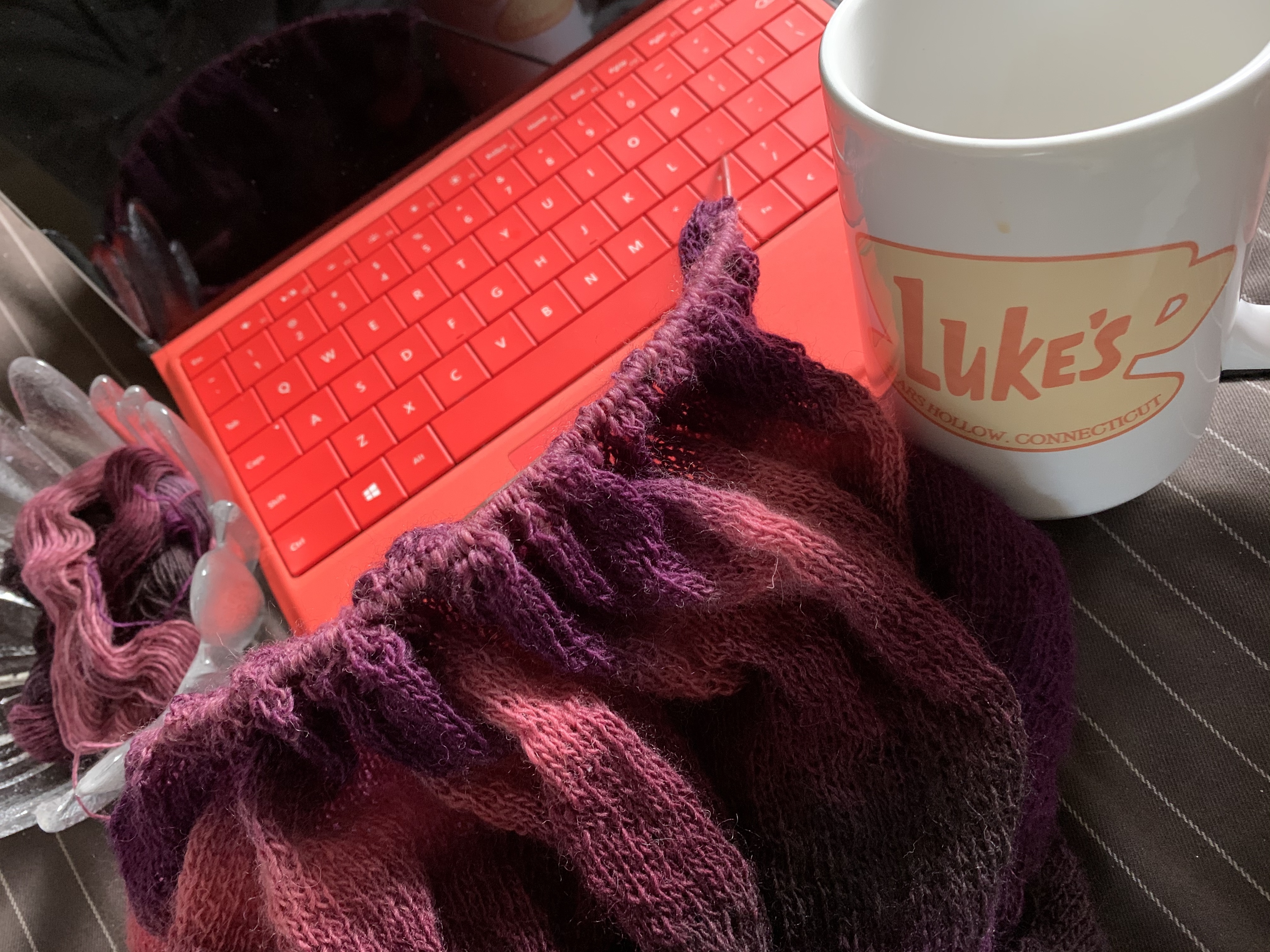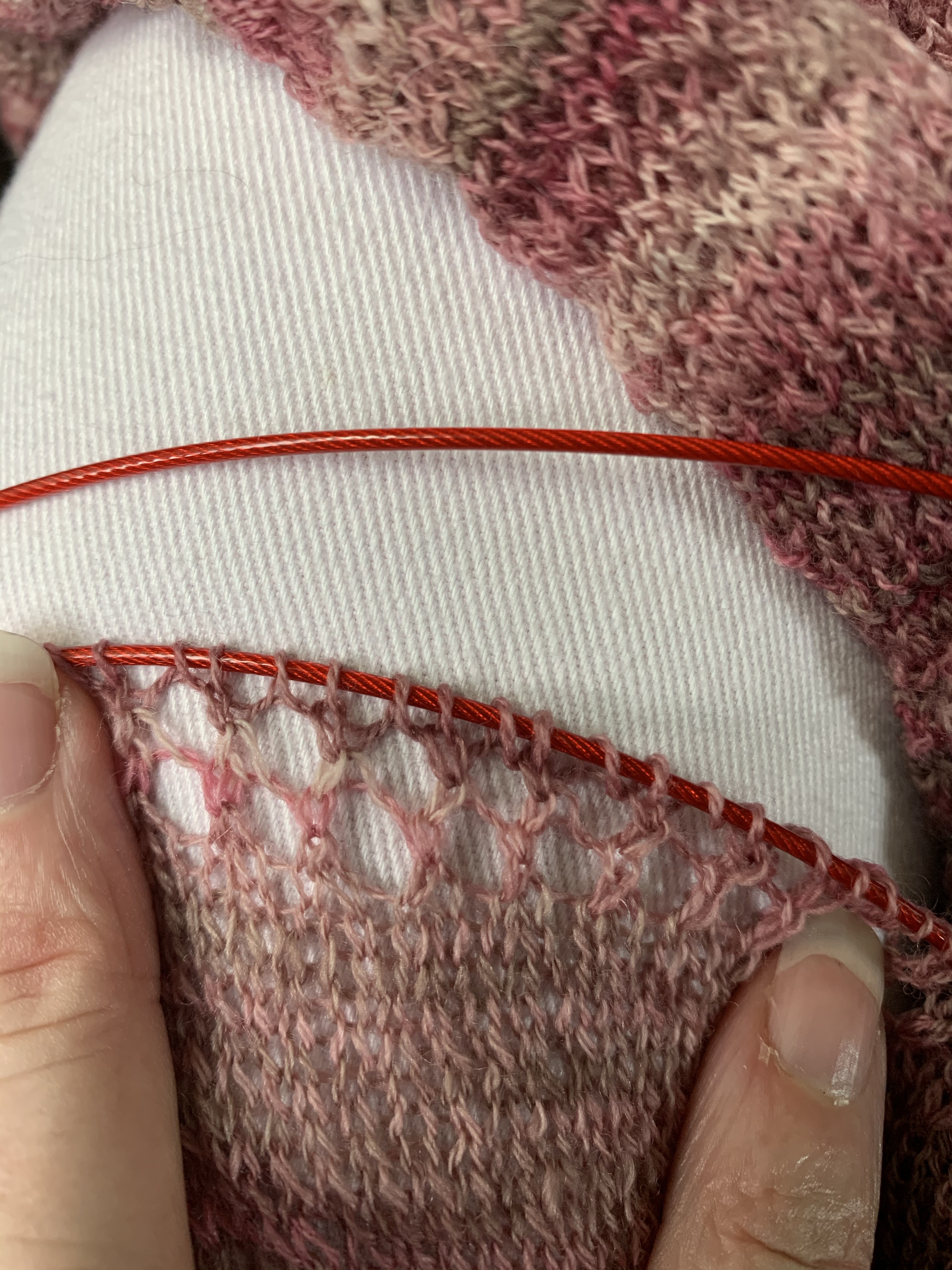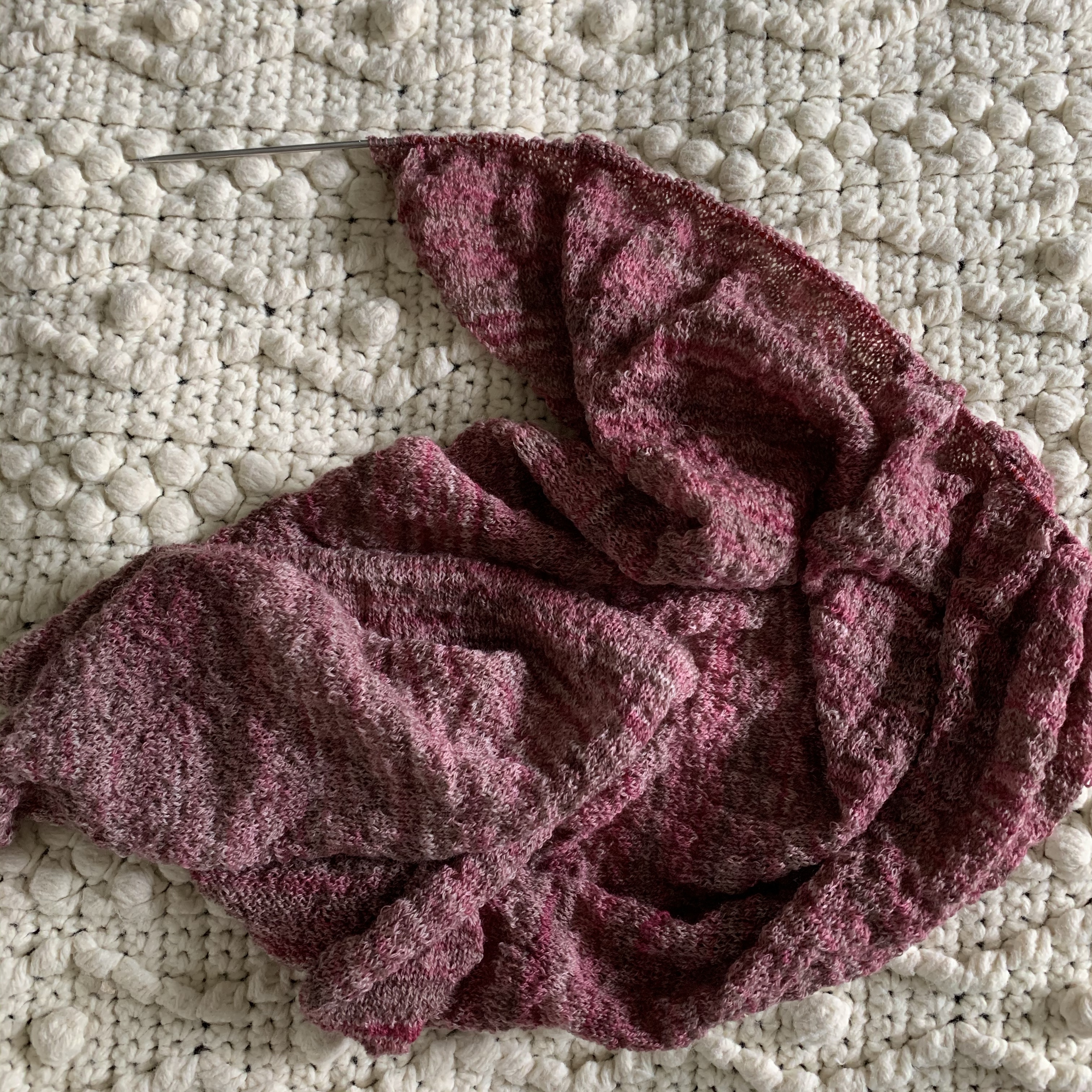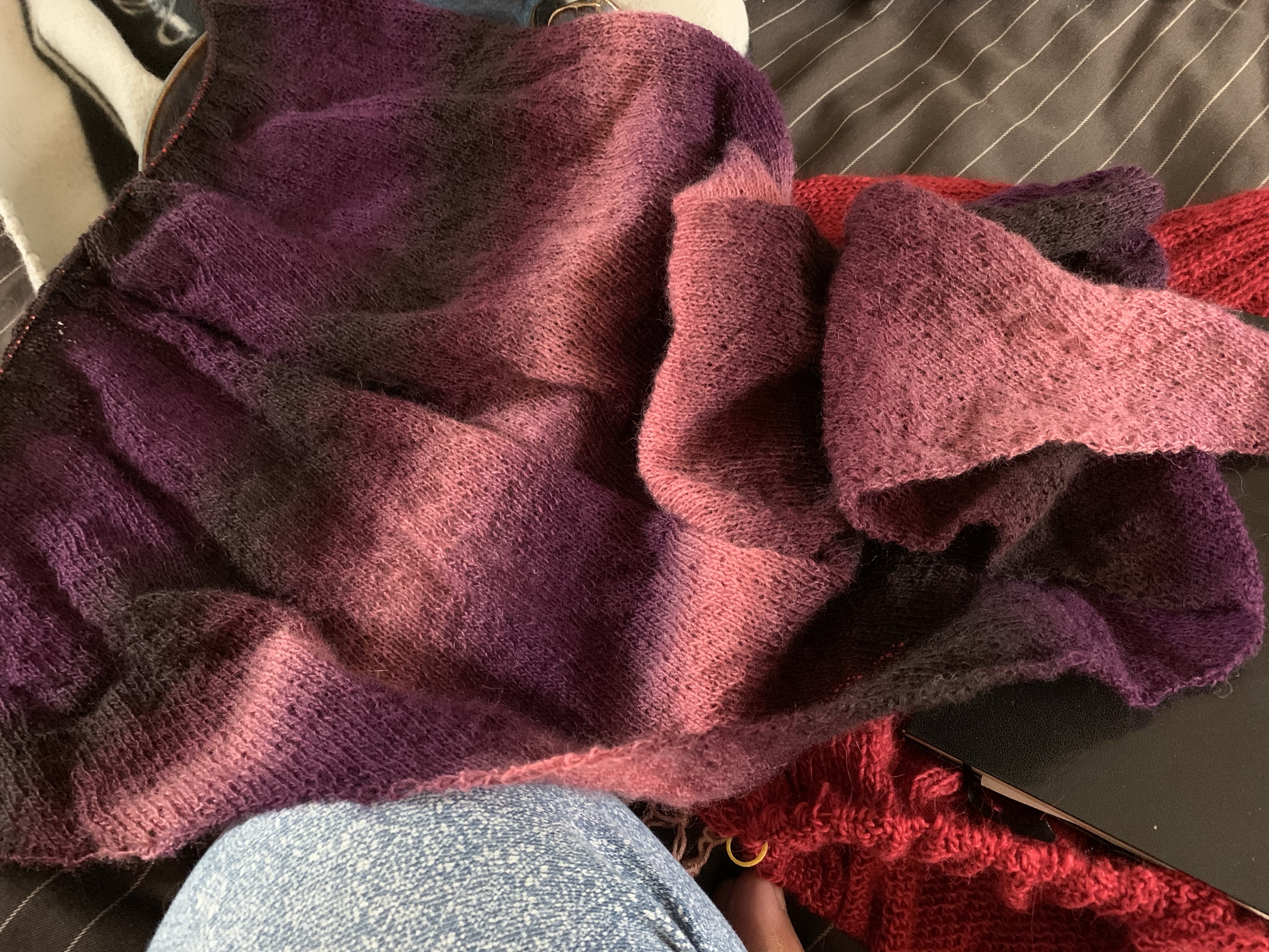 My next finish will be another vanilla bias shawl…this one from a Schoppel-Wolle Lace Ball that fades pink-purple-almost black then back and forth. Its almost done except for the BO and a wash.