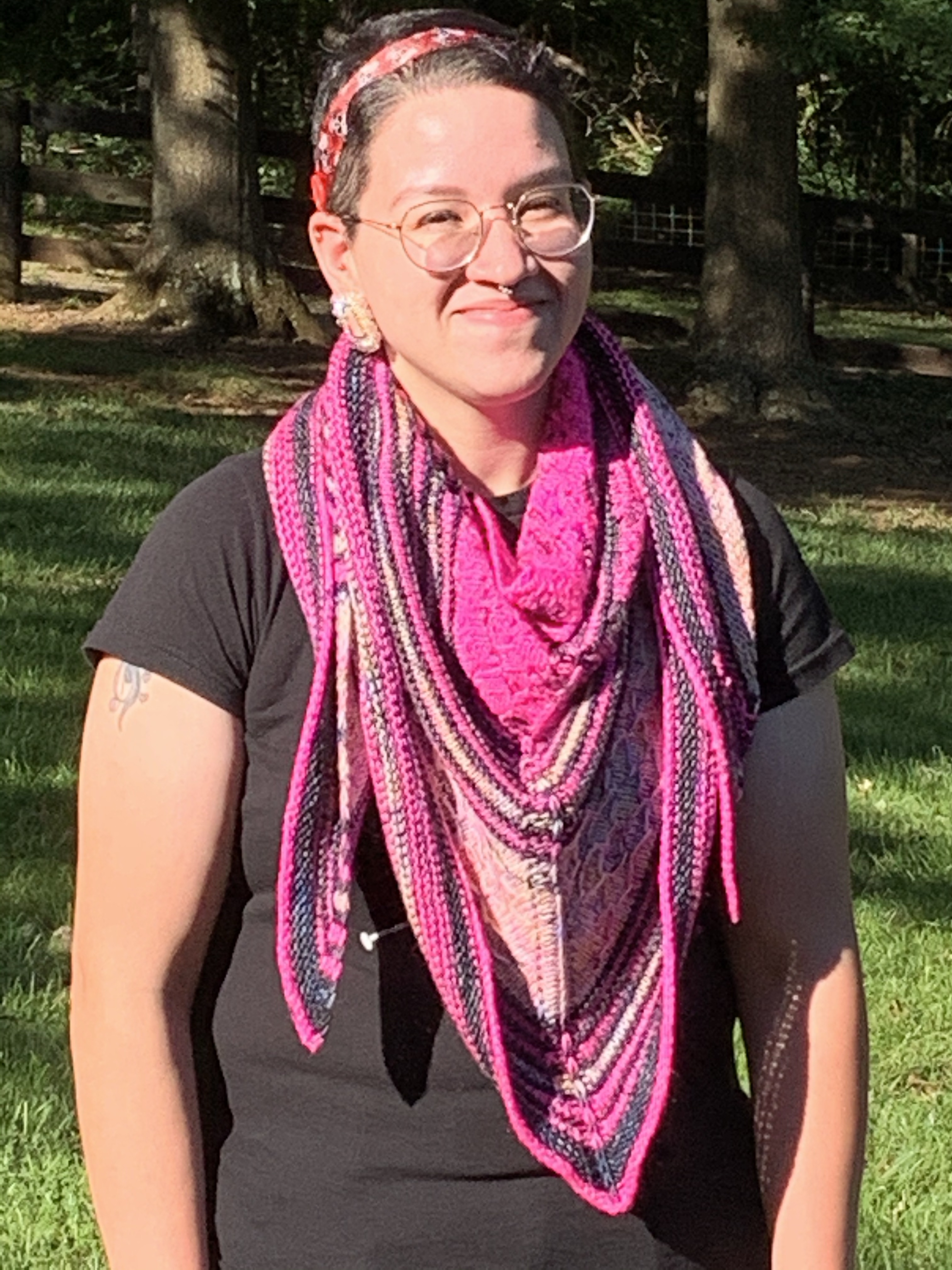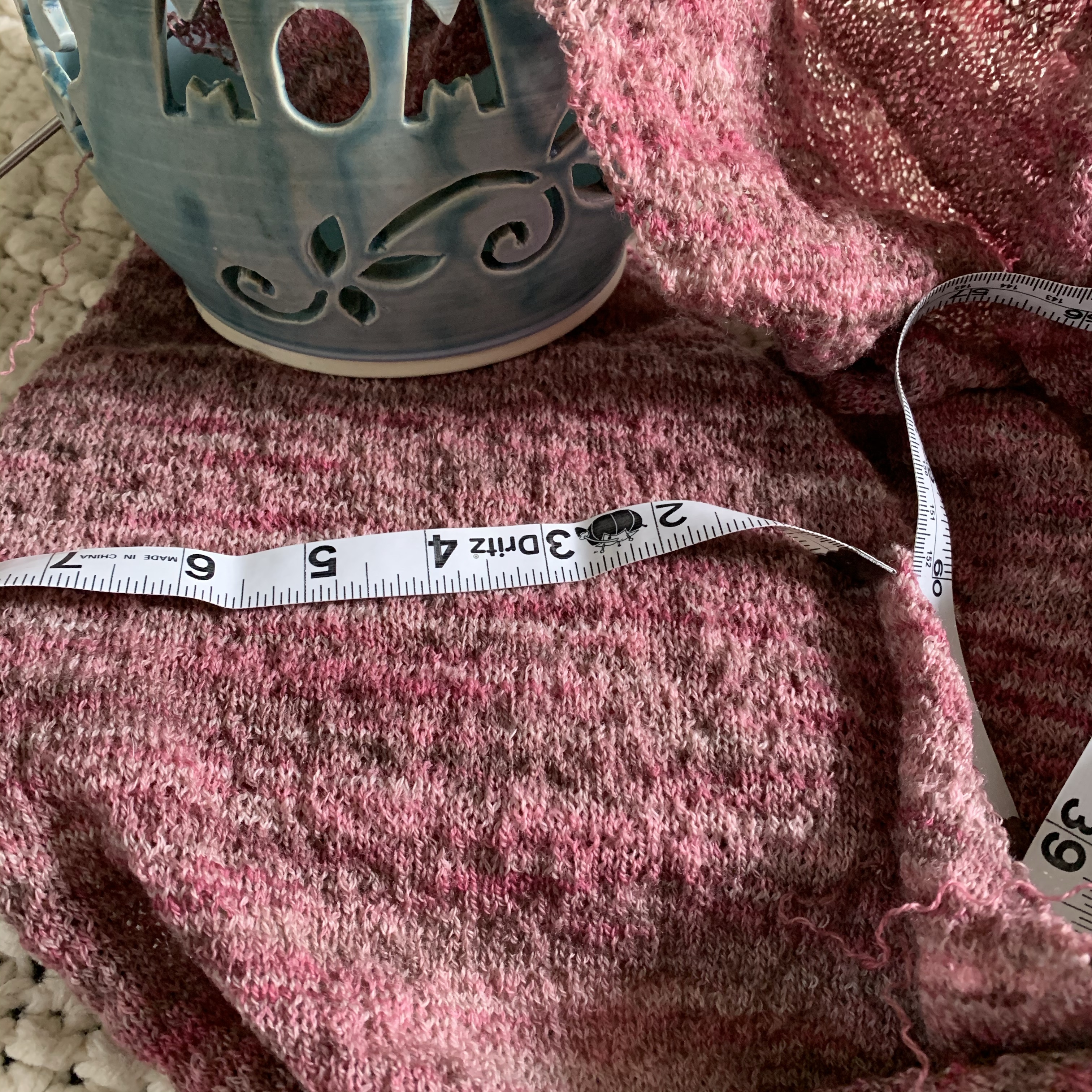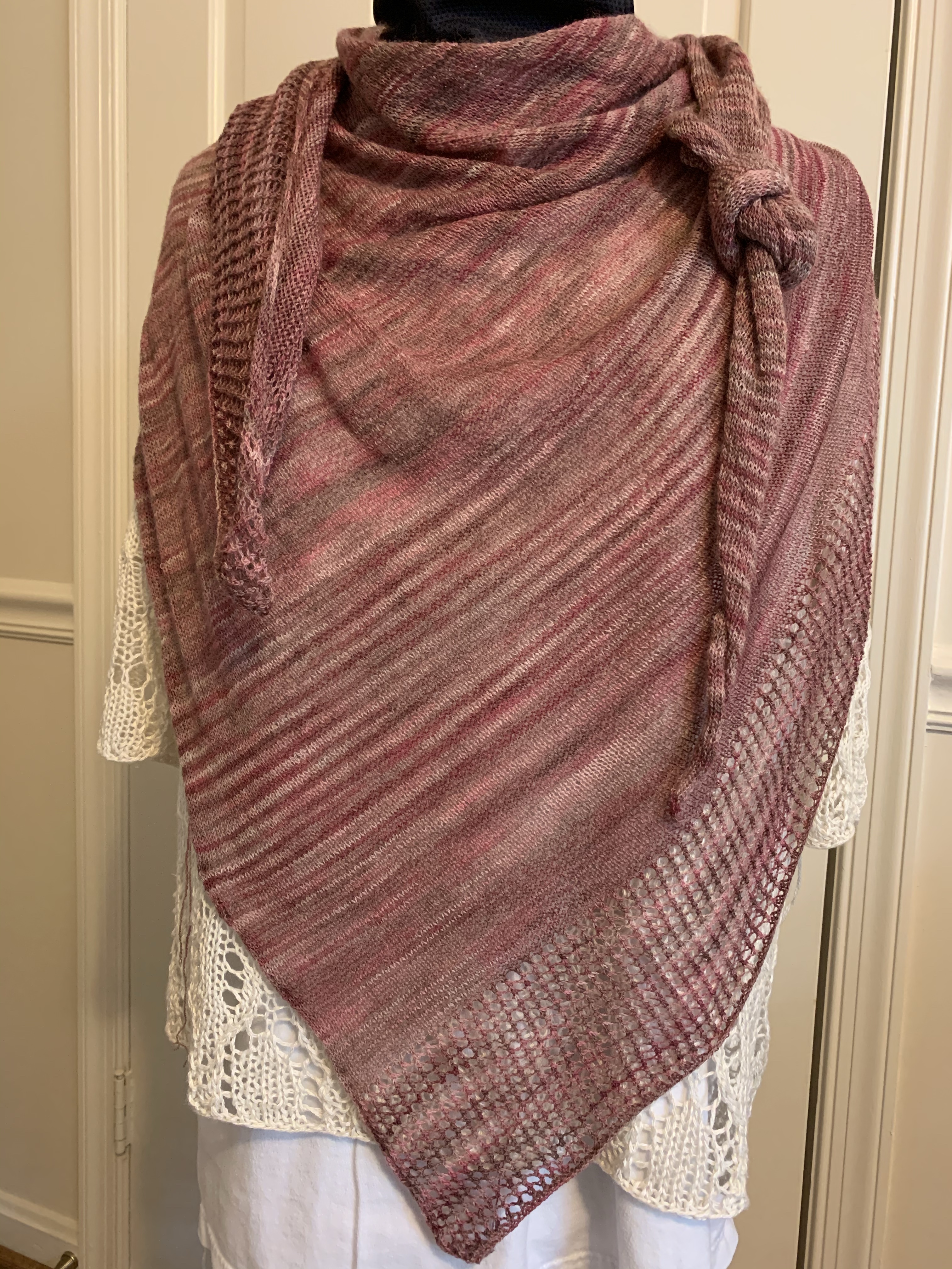 The Bias Pink Shawl is yet another iteration of my standard recipe shawl…a wardrobe staple. CO3, inc up one side almost to desired length/yarn usage, change from stockinette to (yo,k2tog) just long enough so that yarn-chicken isn’t necessary to complete a stretchy BO. A lovely layer that will go with multiple ‘pink’ options.