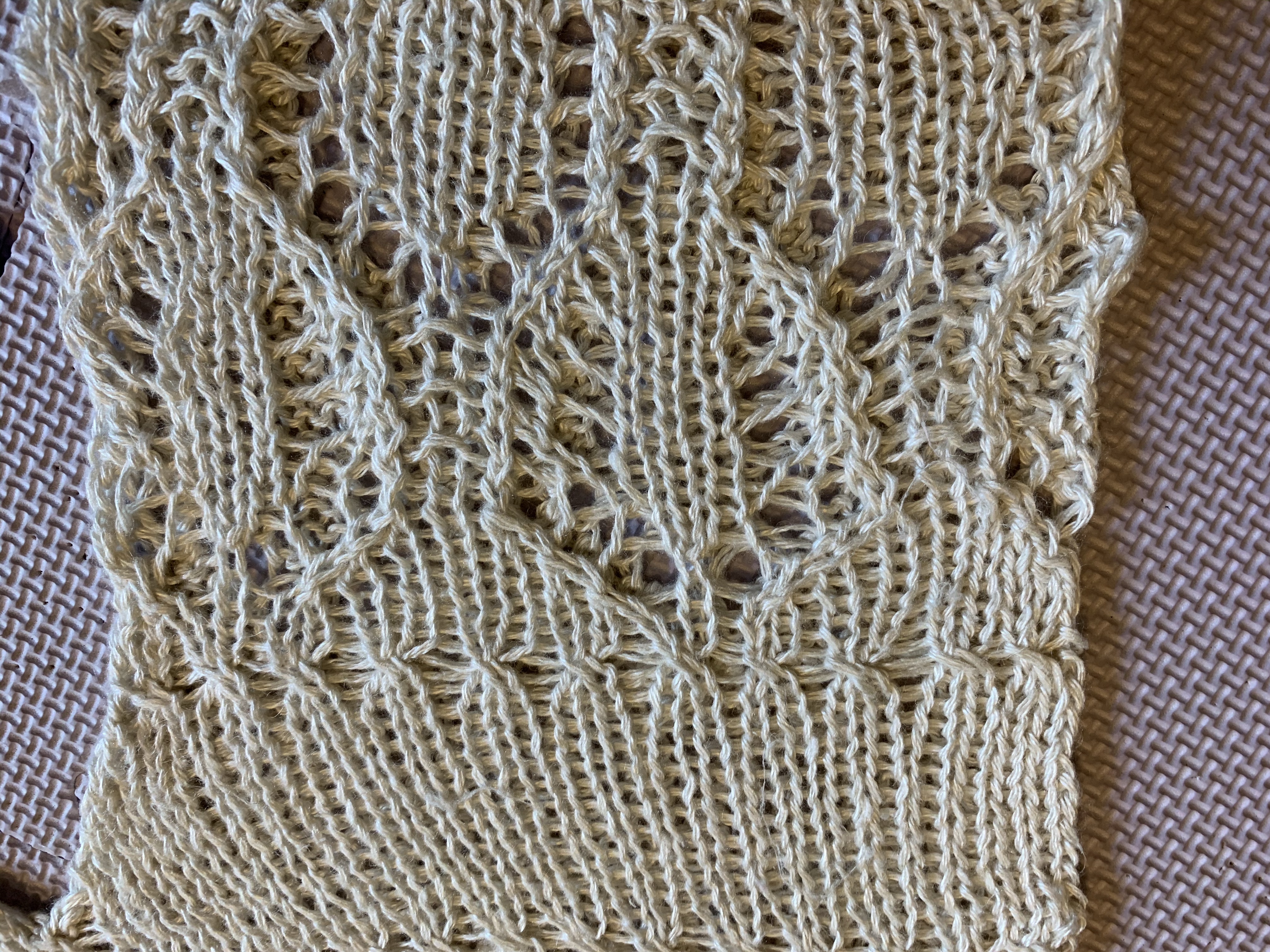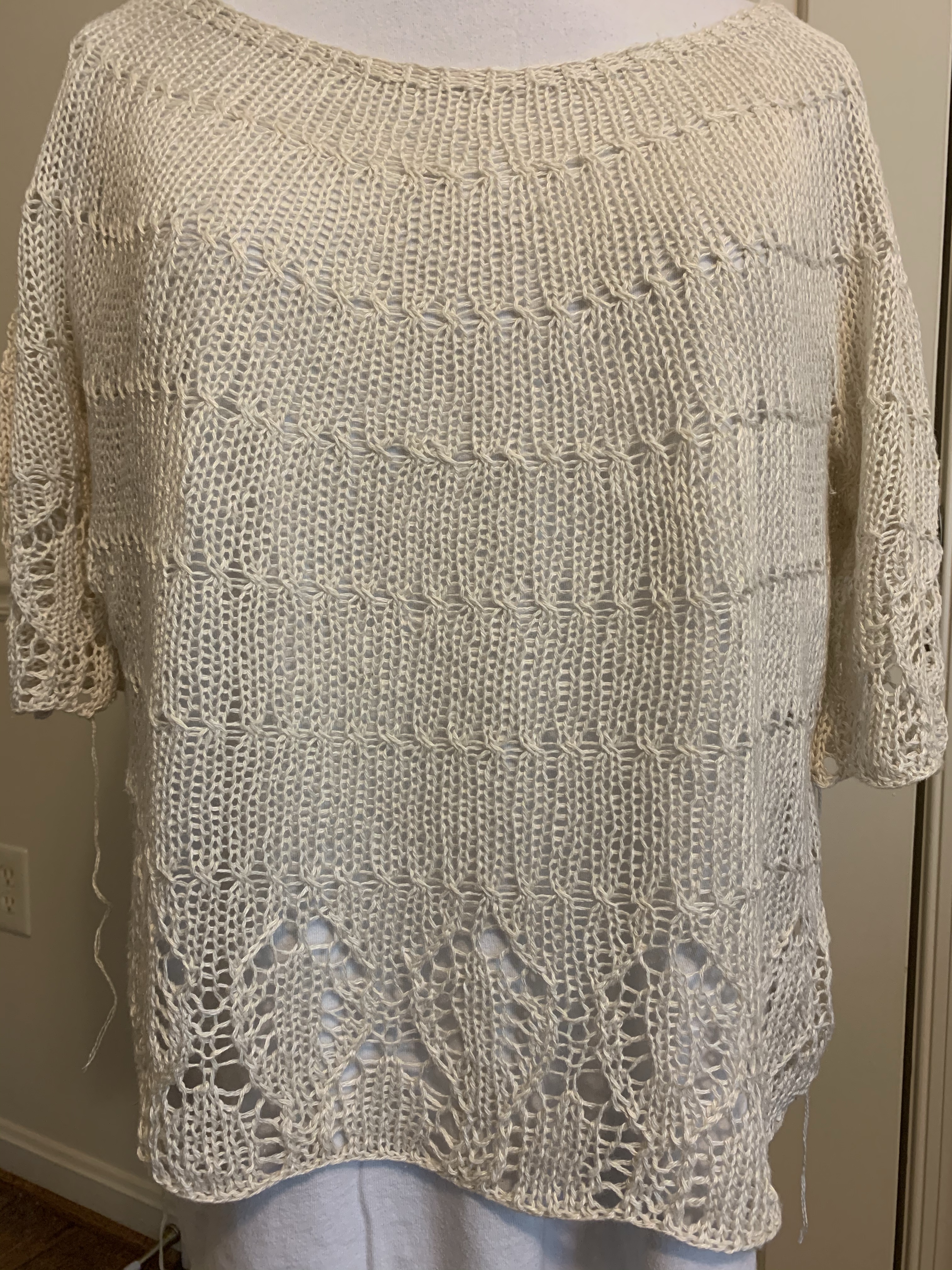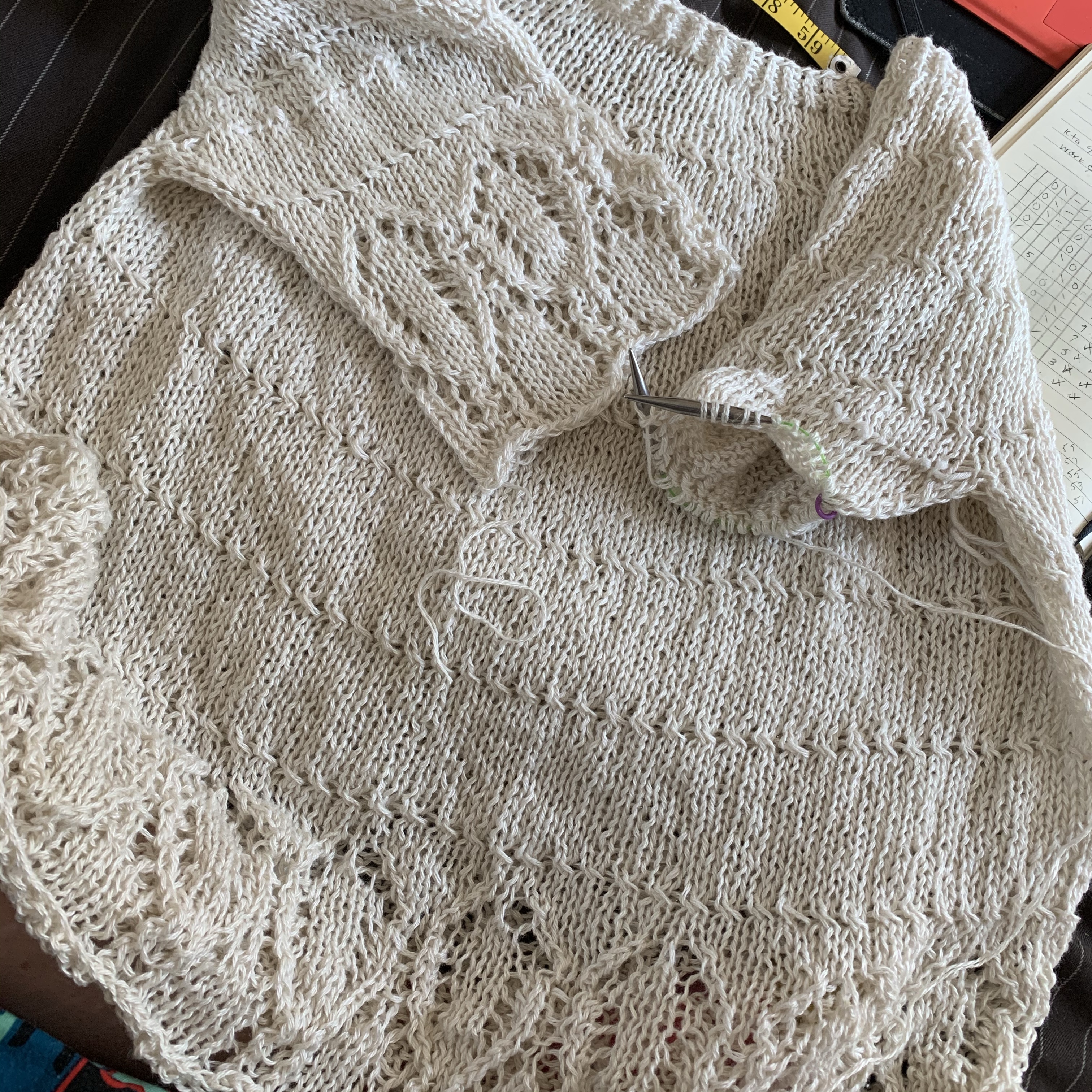 The Cedar Pullover is a lovely pattern by Joji Locatelli and yarn by Sweet Paprika (held double). The neck is modified to change the seemingly random yoke increases, which show horribly…why do designers do this? I shortened the distance between the purl rows to be able to incorporate the increases/hide them in the row above for a much smoother fabric. Knit to my desired length then added the lace panel as instructed. Then, when knitting the sleeves, I knew I wanted this very light top to have 3/4 sleeves and to be finished with the same lace as the hem, so changed the decreases to accommodate these changes. Viola!