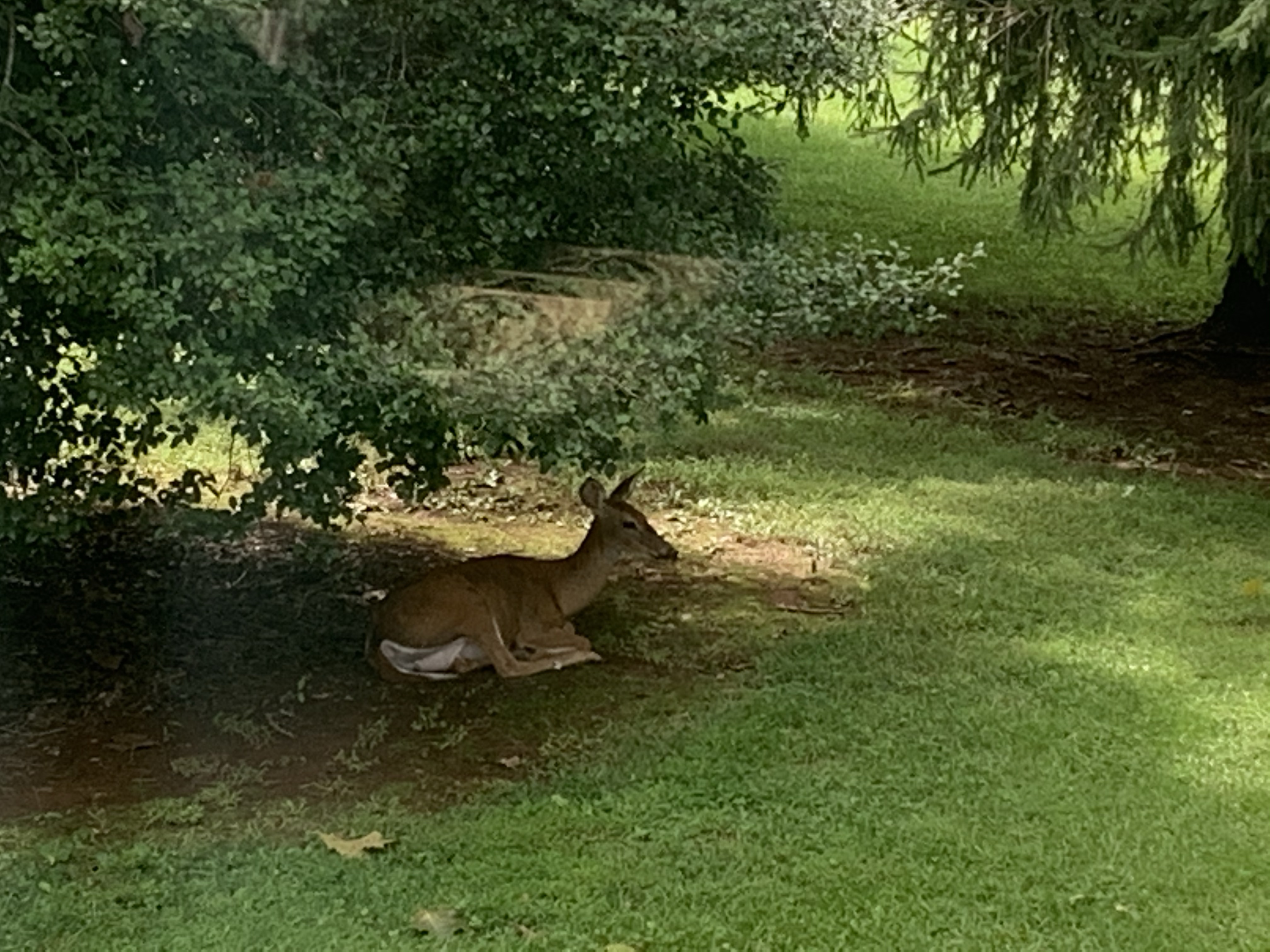 The oldest daughter stopped by for a short social-distance visit last weekend, so was able to give her the Miette Shawl destined for her (also knit one for myself and one for the baker). This lovely pattern by Cozy Up Knits has appeared in previous posts, but was able to get some additional photos with a live model! Abby made an appearance, too. As the weather has turned cooler, the local dear population has become a more cohesive group and we’ve had the pleasure of watching them up close….