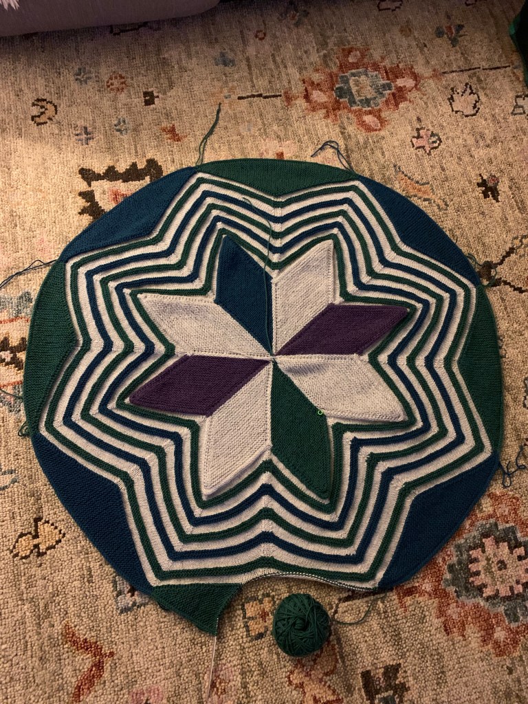The brioche section’s inc/dec for the star’s ‘peaks and valleys’ was just too open. So….knit rip knit rip…..redesigned….alternating colors C and D, created short row sections to even out the circle. With color C or D, pick up stitches from one point to the next so RS maintains k stitches, initial sections requires an additional 3st co for Icord edge plus one to start the row. Inc row: k3 (Icord sts), k to last 2sts, kfb, k last st tbl w/edge st to join. This method creates a join edge that looks almost like an Icord so each section appears to be a half of what the initial star sections look like. Non-inc row, k to last st, join as above. All WS: (k back backward to avoid turning blanket every row) sl join st w/ yarn on ws, k to last 3sts, sl3. Repeat to center of valley, change kfb to k2tog to decrease back to 5 sts: 1edge, 1body and 3Icord sts. Repeat around. NEXT – how many st to pick up around to work brioche section?????!!!!!