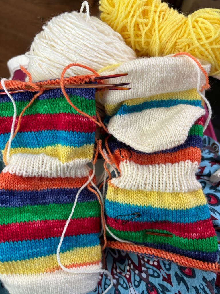Purse knitting makes the time go so quick! Unless it doesn’t, but that’s a yarn-tail for another day. Yesterday was my husband’s 6 month screening day, so wait at the imaging center, wait at the lab, wait in the Dr’s lobby, wait in the exam room. And….we have socks: